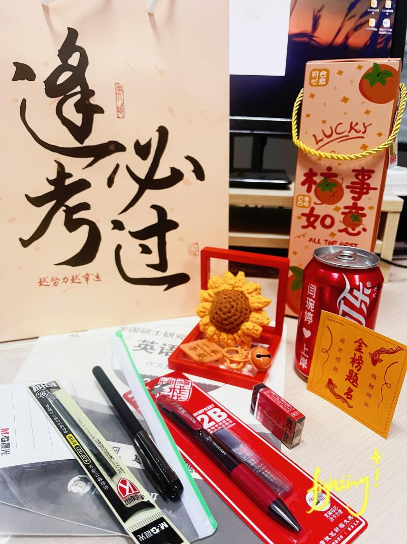 学院党委书记王林、院长沈晓芹、院党委副书记、副院长赵阳为即将奔赴考研“战场”的同学们加油鼓劲,送上了学院精心准备的考研加油包,此次考研加油包内容丰富,包括两套考研冲刺试卷、文具套装、向日葵祝福挂件,印有学生姓名和上岸字样的可口可乐,希望每位同学能够攻“可”难题,一举夺“魁”,每一件精心准备的礼物装在印有”逢考必过“的纸袋里,盛满着学院领导和老师的关切和祝福,期望每一个考研人能够顺利上岸!同学们备受鼓舞,纷纷表示在备考复习过程收到学院的关心和鼓励,感到十分温暖,大家一定会坚持到底,成功上岸。