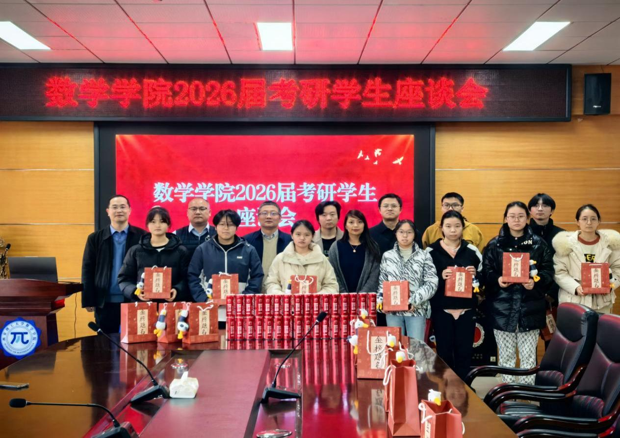 为切实助力2026届考研学子冲刺备考,缓解备考压力,12月15日下午,数学学院在9-320举办2026届考研学生座谈慰问会。学院党委书记王林、院长沈晓芹、党委副书记兼副院长刘东、副院长苏李君、段献葆以及毕业班辅导员共同为考研学子送上关怀与祝福,助力同学们以最佳状态迎战考研。