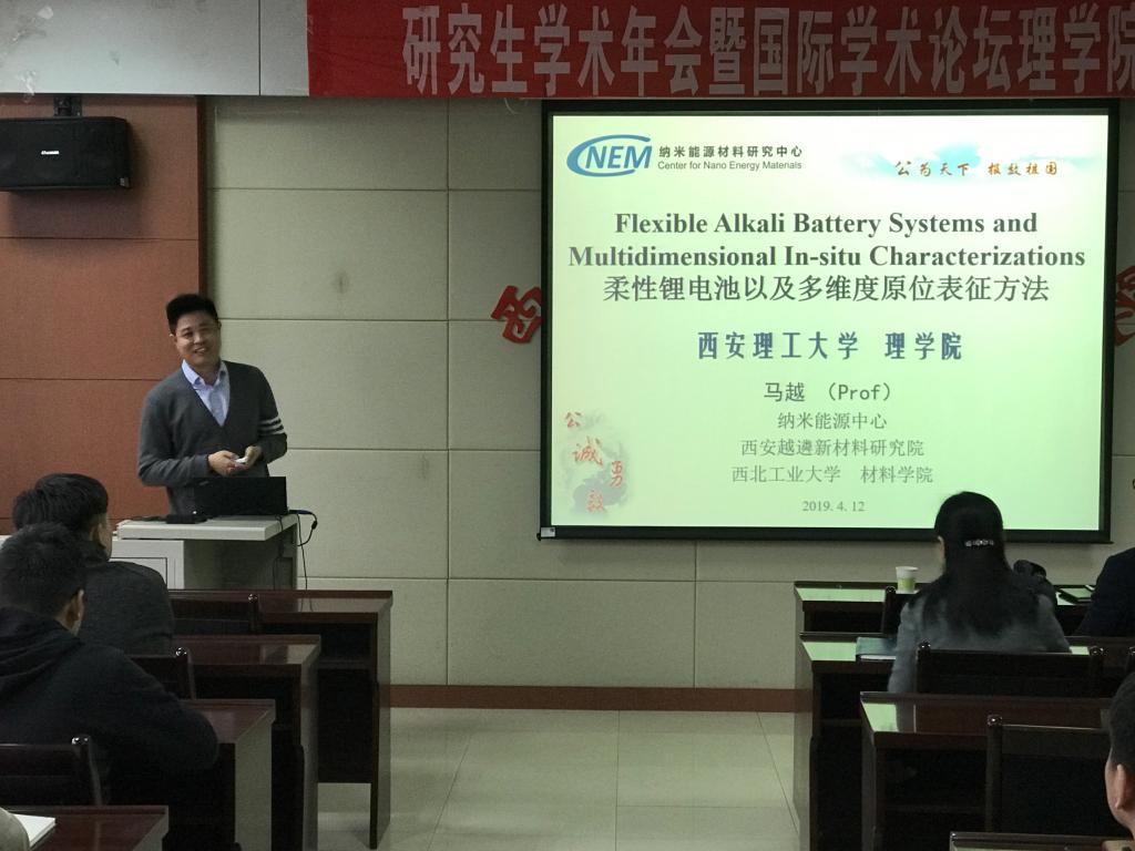 4月12日上午10点,应应用化学系邀请,西北工业大学纳米能源中心、西安越遴新材料研究院马越教授在教九楼理学院报告厅作了题为《柔性锂电池以及多维度原位表征方法》的学术报告。此次报告为西安理工大学推进“双一流”建设暨建校70周年庆典的理学院第三场学术报告。