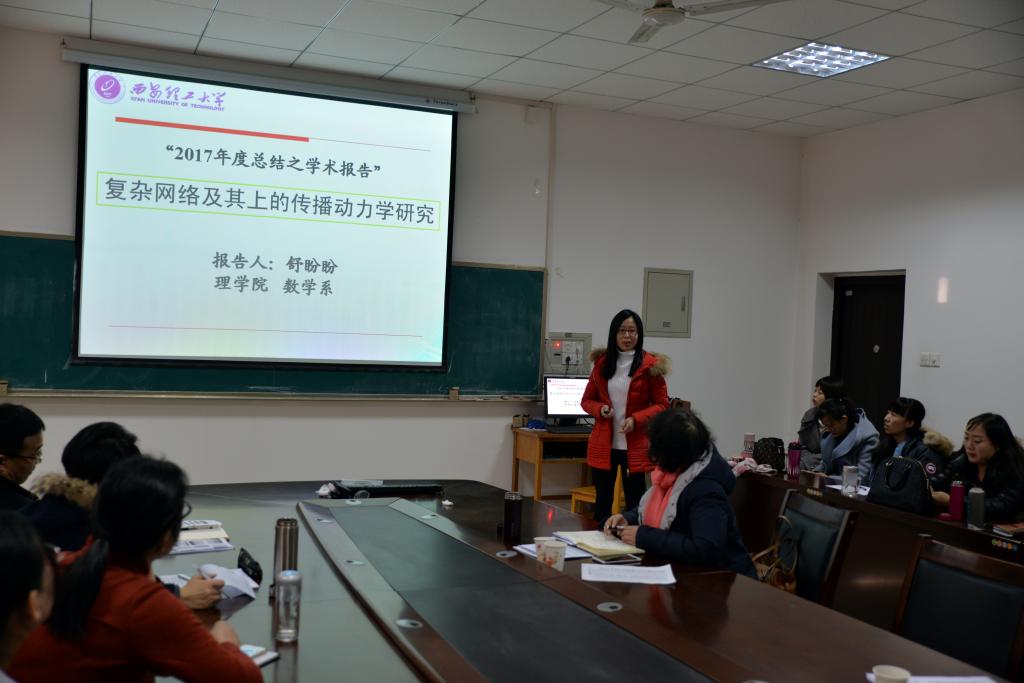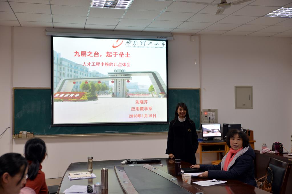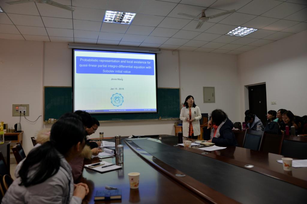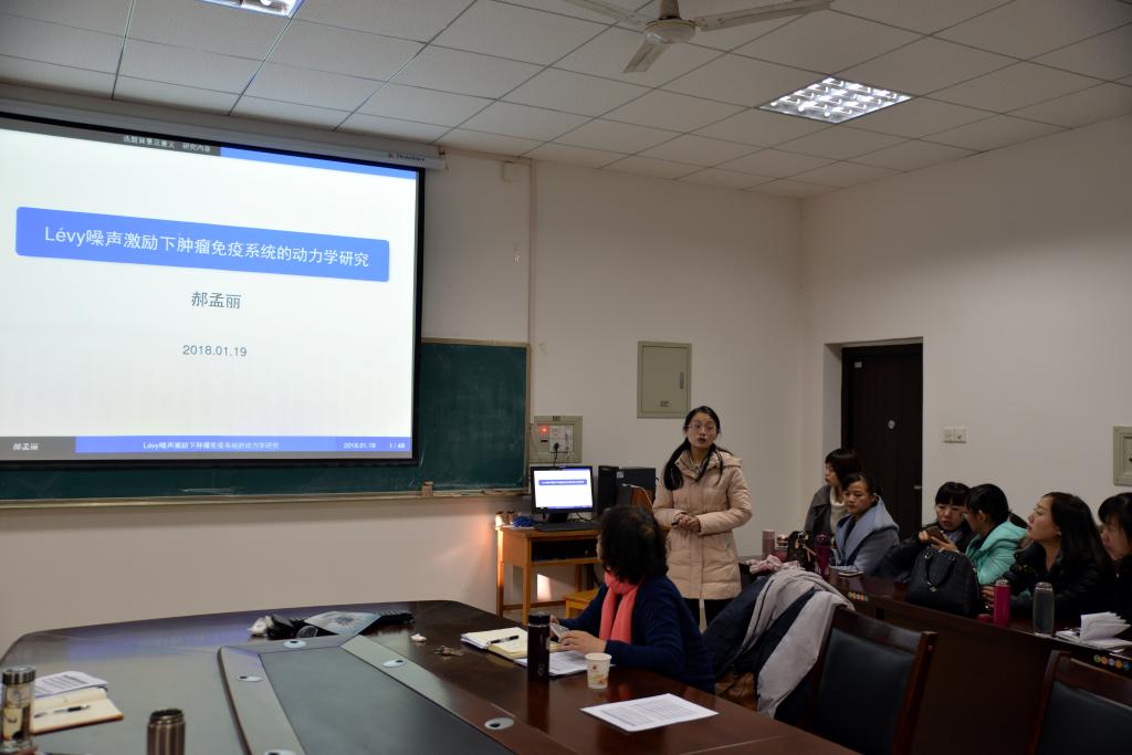 19日上午,徐金虎、郝梦丽、苏盼盼、王金霞等四位青年基金获得者分别作了《具有年龄结构和细胞间感染的病毒动力学模型分析 》、《Lévy 噪声激励下肿瘤免疫系统的动力学研究》、《 复杂网络及其上的传播动力学研究 》、《具有Sobolev初值的拟线性偏积分-微分方程的概率表示和局部存在性》的学术报告。2017年校讲课比赛一等奖获得者王兴、陕西省“青年杰出人才”获得者沈晓芹分享了参加学校讲课比赛、人才工程申报方面的经验和体会。
