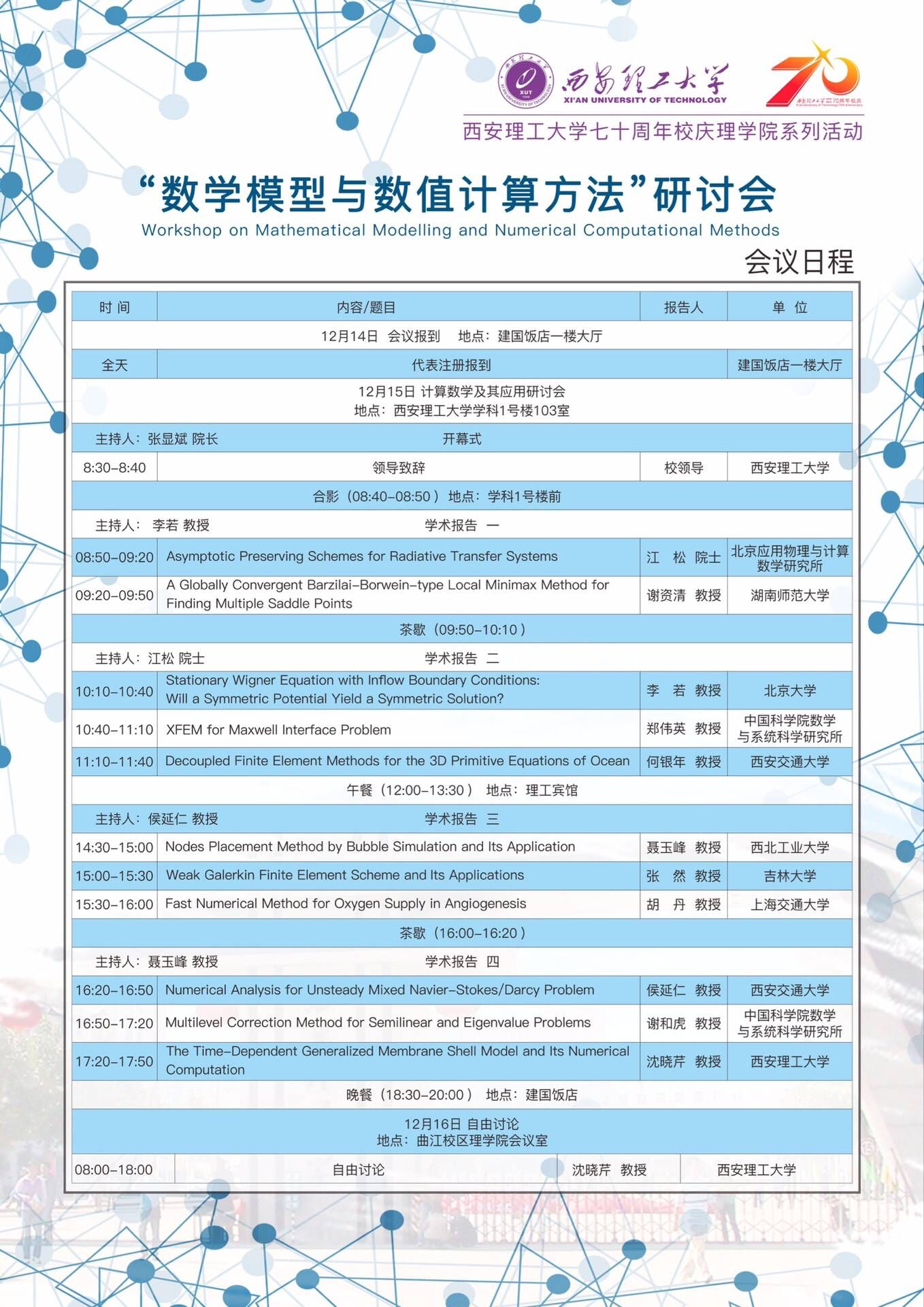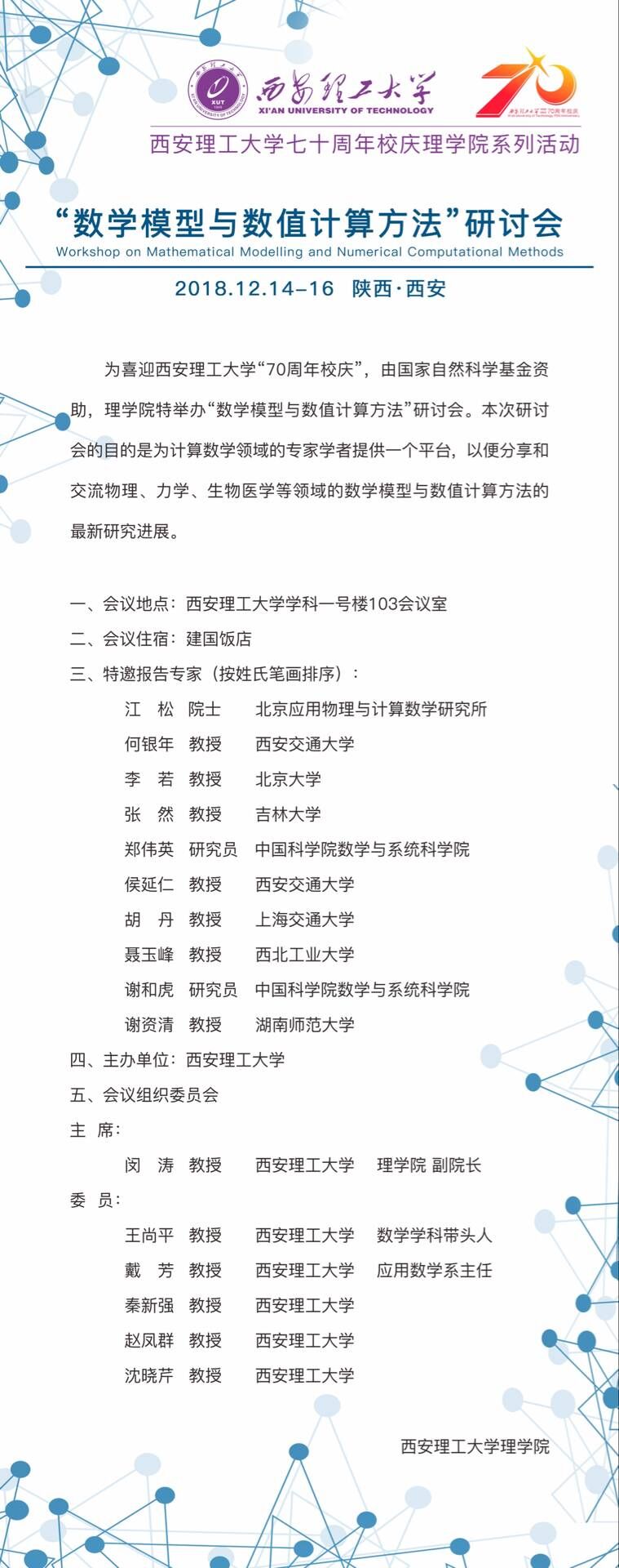 为喜迎西安理工大学“70周年校庆”,由国家自然科学基金资助,理学院特举办“数学模型与数值计算方法”研讨会。本次研讨会的目的是为计算数学领域的专家学者提供一个平台, 以便分享和交流物理、力学、生物医学等领域的数学模型与数值计算方法的最新研究进展。