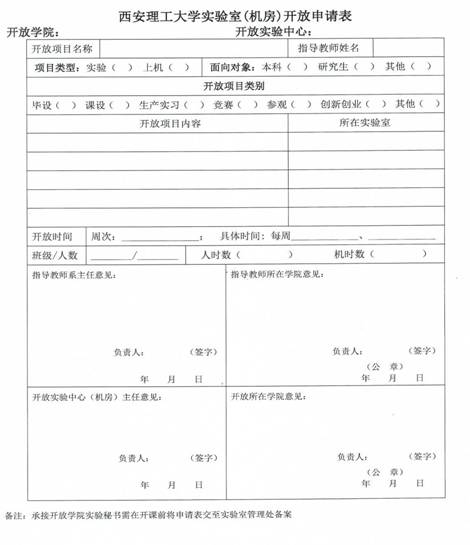 2、需要使用实验室进行实验教学的课程,由教学秘书在前一学期根据教学计划下发教学任务单,并在开学初由任课教师凭借教学任务单及《西安理工大学实验室(机房)开放申请表》到实验室进行预约登记。