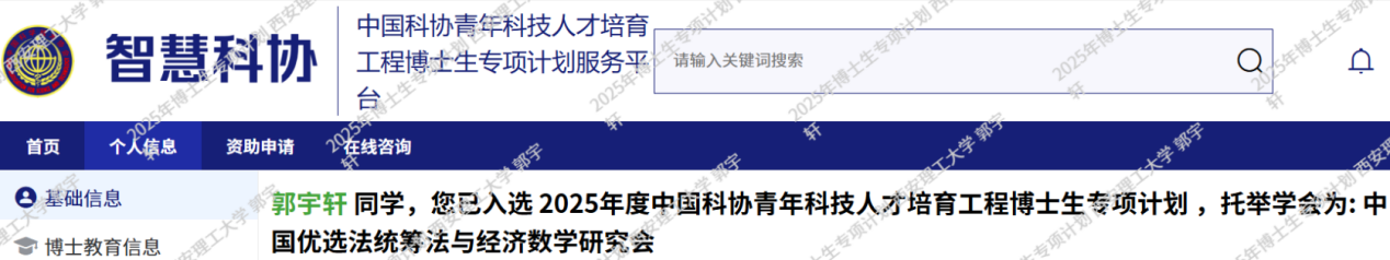 本次选拔过程严格规范,竞争激烈,全校共申报30人,历经个人申报、学院择优推荐、学校评审、省级科协审核推荐等多轮环节,最终由中国科协组织专家进行综合评议与遴选。郭宇轩同学凭借其突出的科研潜质、扎实的学术基础和清晰的培养规划,在众多候选人中脱颖而出。