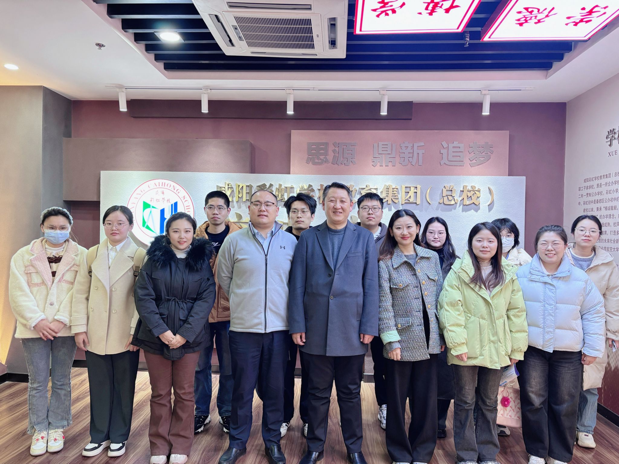 为精准对接基础教育领域用人需求,拓宽毕业生就业渠道,深化校地协同育人合作,12月10日,数学学院党委副书记刘东,学生工作办公室主任、研究生辅导员刘梦以及研究生毕业生代表一行10余人赴咸阳彩虹中学开展访企拓岗活动。咸阳彩虹中学副校长王常青和人力资源主任王祎婧热情接待了师生。